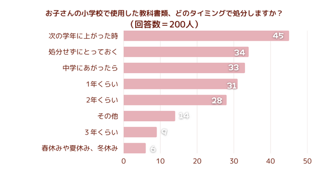 「お子さんの小学校で使用した教科書類、どのタイミングで処分しますか?」とアンケート調査した結果、1位は『次の学年に上がった時』でした。