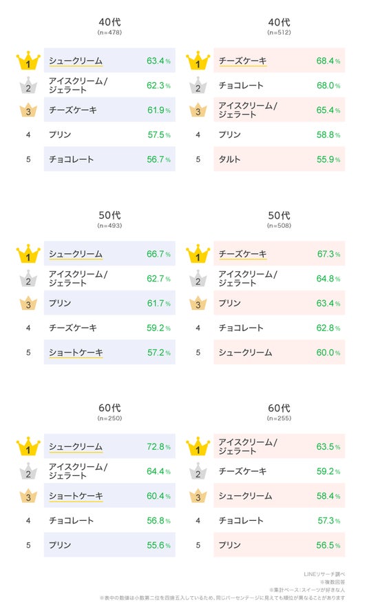 全体1位は6割超で「アイスクリーム/ジェラート」。2位以降は「チョコレート」「チーズケーキ」「シュークリーム」が続きました。