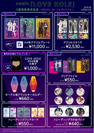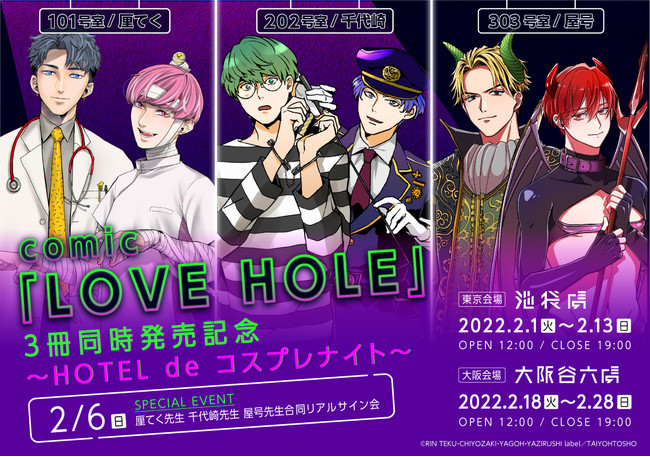株式会社TORICO(本社:東京都千代田区 代表:安藤拓郎)は、2022年2月1日(火)~2月13日(日)まで東京都豊島区西池袋「池袋虜」にて、2022年2月18日(金)~2月28日(月)まで大阪府中央区谷町6丁目の「大阪谷六虜」にて、comic「LOVE HOLE」3冊同時発売記念~HOTEL de コスプレナイト~を開催いたします。