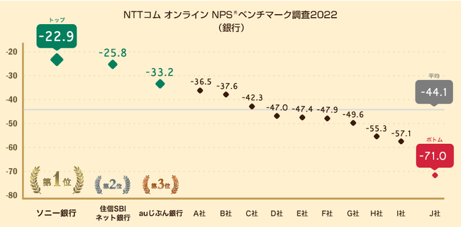 NTTコム オンライン・マーケティング・ソリューション株式会社(本社:東京都品川区、代表取締役社長:塚本 良江、以下NTTコム オンライン)は、NPS(R)ベンチマーク調査2022銀行部門を実施しました。この結果、最もNPS(R)が高いのはソニー銀行となりました。