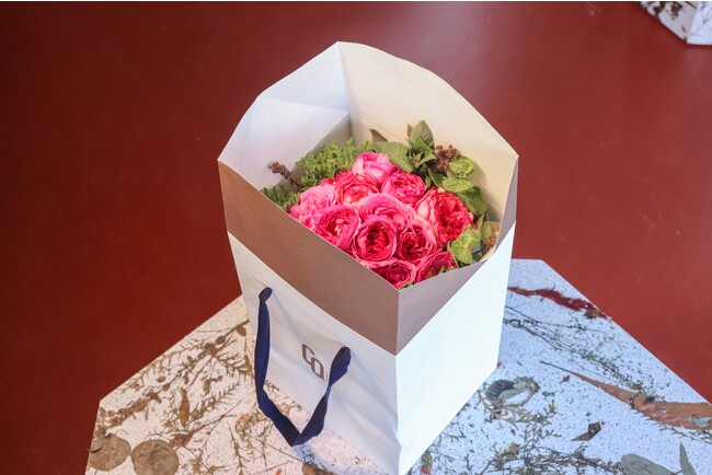まだまだお花を持ち歩くことに恥ずかしさのある男性方が多いなか、ボックスのようなパッケージの中にお花を入れあえて隠してしまうことで恥ずかしさを払拭すると共に、ギフトをもらう側も開けるまで何が入っているかわからないワクワク感やサプライズを演出します。