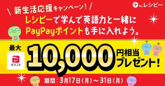 株式会社ポリグロッツ(本社:東京都新宿区、代表取締役:山口隼也)は、英語学習アプリ「レシピー」において、新生活応援キャンペーンを実施しています。本キャンペーンでは、期間中に「Myレシピ」を利用して5日間連続で学習を達成した方に抽選で「PayPayポイント」をプレゼントいたします。