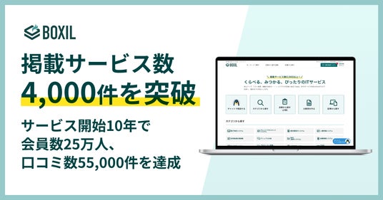 SaaS(※1)比較サイト「BOXIL(ボクシル)」を運営するスマートキャンプ株式会社(本社:東京都港区、代表取締役社長CEO:林 詩音、以下「スマートキャンプ」)は、2025年11月に掲載サービス数が4,000件を達成したことをお知らせします。また、「BOXIL」は2025年9月にサービスの提供開始から10周年を迎えました。