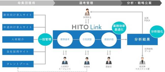 HITO-Link リクルーティングは、採用管理の生産性を向上するクラウドサービスです。採用管理の生産性向上の支援に向けて「応募者との多様な接点の集約」や「応募につながるアクションの効率化」に貢献します。人材紹介・求人媒体・アグリゲーションサイトなどの様々な応募者情報を全自動で一元管理しながら、採用人事部の課題としてあがりやすい応募数の向上や歩留まり改善・高度な分析を提供し、導入企業様の採用の価値を最大化します。