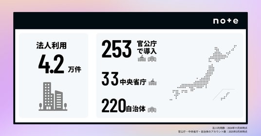 一方、公的な団体や官公庁もnoteでの情報発信を積極的に展開しています。省庁では政策への国民理解を促進するため、自治体では移住促進や企業誘致、住民向けの細やかな情報提供など、それぞれの課題に応じた活用が広がっています。現在では、ほぼすべての都道府県で、1つ以上の自治体がnoteを活用した情報発信に取り組んでいます。