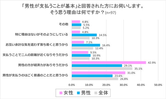 この設問では「男性が支払うことが基本」と回答した全体の約4分の1にあたる男女97人にその理由を質問いたしました。