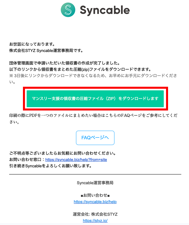 - 作成した領収書はSyncable上には保存されません。(再発行が必要な場合は同手順で再作成が可能です)
