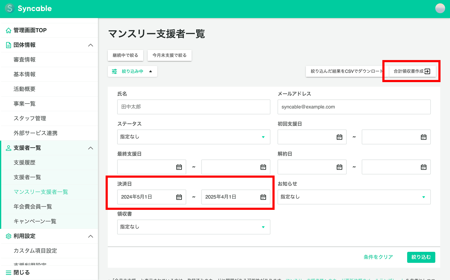 団体管理画面「マンスリー支援者一覧」から、決済日を1年以内で絞り込み、「合計領収書作成」ボタンをクリック