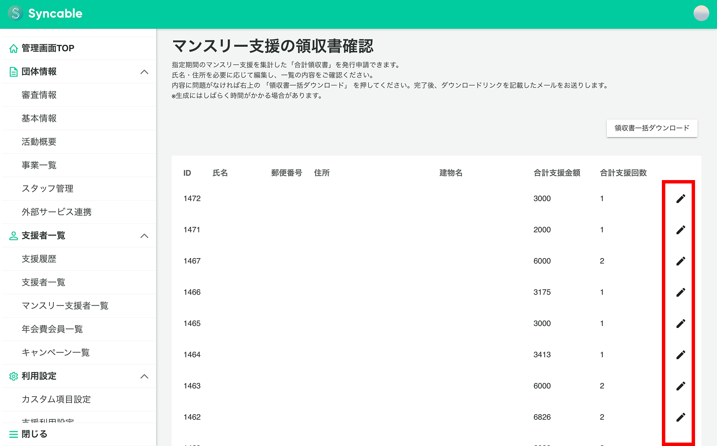 表示される確認画面で、必要に応じて氏名や住所を編集(赤枠のペンマークから)し、右上の「領収書一括ダウンロード」ボタンをクリック