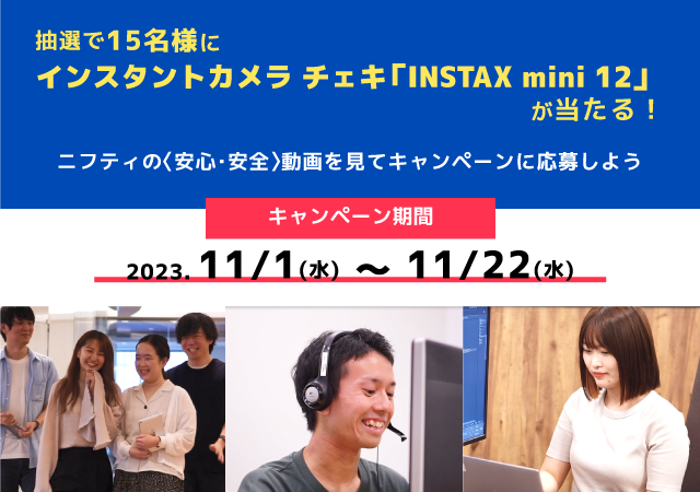 1.キャンペーン期間中、ニフティ株式会社のX(旧Twitter)またはInstagramの公式アカウントにて11/1(水)・11/10(金)に投稿する「安心・安全動画」を視聴