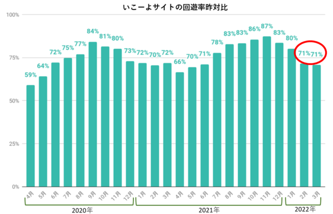 続いて、いこーよサイトの回遊率についてです。以下グラフは、2020年4月からのいこーよサイト内の回遊率(サイト内の複数のページを巡って閲覧する率)を、コロナ前の2019年と比較したものです(2019年を100%として比較)。回遊率が高いほどユーザーのお出かけ意欲が高く、複数の施設からお出かけ先を積極的に検討していることを表します。