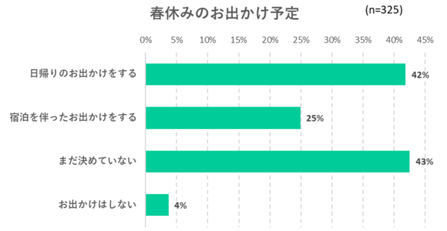 春休みのお出かけ予定について聞いた質問では、「日帰りのお出かけをする」が42%、「宿泊を伴ったお出かけをする」が25%と、お出かけ意欲が非常に高い様子が見られます。「まだ決めていない」という回答も43%と高めですが、一方で「お出かけはしない」と明確に決めている家族は4%しかいません。