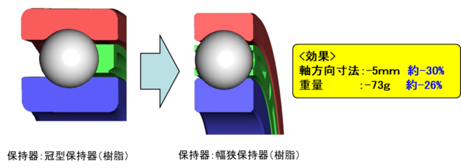 軸受性能(強度、耐久性)は従来品と同等、軸受幅は従来品に対して極限まで狭める事を達成しました。汎用サイズ(6207)への適用で、軸方向寸法5mm(約30%)の短縮、重量は73g(約26%)の低減となります。これにより、同軸タイプや3軸タイプeAxleに搭載することで、ユニット長の短縮化を可能とします。