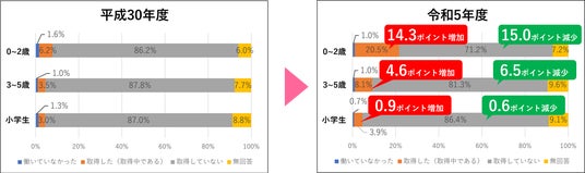 父親の育児休業について、「取得した(取得中である)」と答えた人の割合が、H30年度と比較して、「0~2歳」「3~5歳」「小学生」のすべてで増加しました。