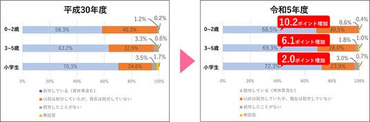 母親の就労の有無について、「就労している(育休等含む)と答えた人の割合が、H30年度と比較して、「0~2歳」「3~5歳」「小学生」のすべてで増加しました。