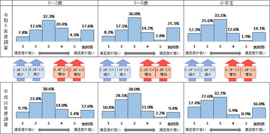 「0~2歳」「3~5歳」「小学生」を経年比較すると、満足度が高い4・5と回答した人が上昇する一方、満足度が低い1・2と回答した人は減少しています。