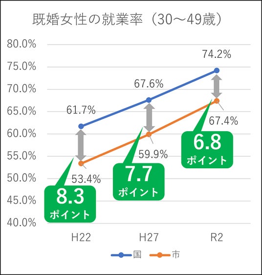 なお、国勢調査において、既婚女性(30~40歳代)の就業率については、全国的に上昇傾向であるが、全国平均と本市との差が縮まってきている状態です。
