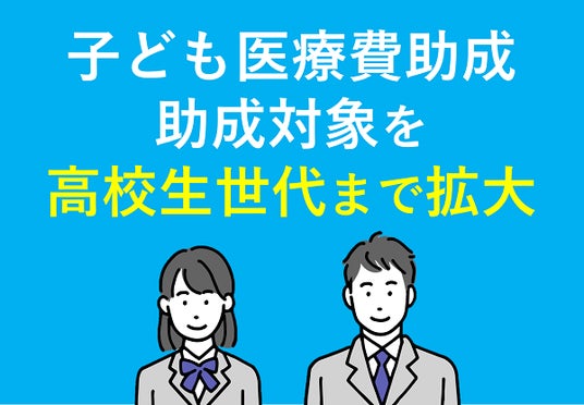 子ども医療費助成対象拡大令和5年度より高校生世代まで対象に。令和6年8月診療分からは、窓口負担が一部負担金のみとなる現物給付の対象も高校生世代まで拡大。