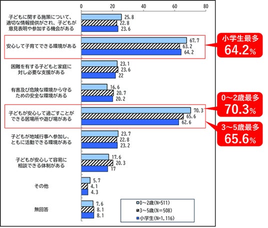 ・「小学生」では「安心して子育てできる環境がある」と答えた人が64.2%、「子ども