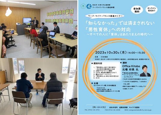 ワーク・ライフ・バランス推進事業を実施奈良市内の企業を対象に、男性の育児休業取得の重要性や効果についての啓発プログラムを実施し、育児休業が企業にもたらす利益や生産性の向上、ダイバーシティ経営の重要性などを伝えるワーク・ライフ・バランス推進セミナーを実施。