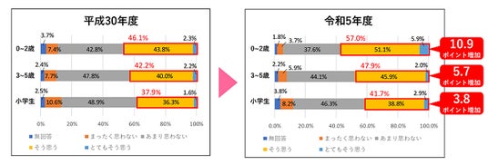 - 前回調査(平成30年度)に比べ、「子どもにやさしいまち」「子育てしやすいまち」と実感する子育て世帯の割合が、対象である「0~2歳」「3~5歳」「小学生」の保護者すべてで増加。
