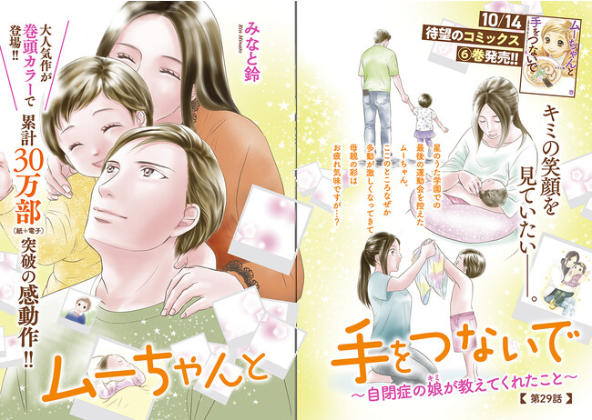 株式会社秋田書店(所在地:東京都千代田区、代表取締役社長:樋口茂)は、発行している月刊女性漫画誌『エレガンスイブ』(編集長:吉野智子)9月26日(月)発売の11月号にて表紙&巻頭カラーにて累計30万部超の自閉症の娘の成長を描く感動作「ムーちゃんと手をつないで~自閉症の娘が教えてくれたこと~」を掲載することをお知らせいたします。10月14日には同作品の最新単行本6巻も発売いたします。