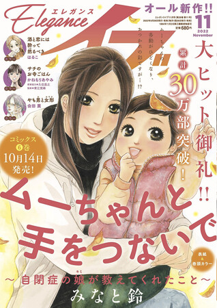 2022年9月26日発売の「エレガンスイブ」11月号の表紙と巻頭カラーで「ムーちゃんと手をつないで~自閉症の娘が教えてくれたこと~」(みなと鈴著)が登場する。