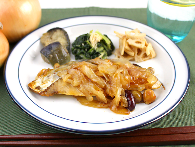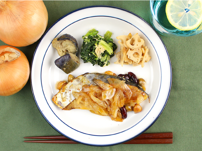 ふっくらとローストしたさわらの下にミックスビーンズ、上にはとろっと食感の玉葱を添え、スイートチリソースを混ぜあわせた黒酢ソースをかけました。黒酢の酸味とほんのりとした辛味をお楽しみください。