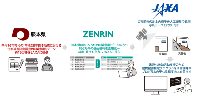 ゼンリンは、熊本県が保有する約15万件の判定情報のうち、正確な位置が特定できない約6万件の被害建物の住所情報に、地震発生前の2016年の地図データを活用して緯度・経度を付与することで、正確な位置特定を可能とし、プログラムの精度向上に寄与します。