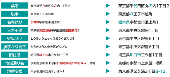 ▲住所の正規化/変換のイメージ 住所表記の誤字や脱字などをクレンジング処理で補正し、正規化します。