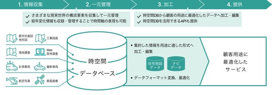 本取り組みの、正確な建物位置の特定はZENRIN Maps API※を介してゼンリンの高度時空間データベースと連携し、住所表記のゆれ等を正規化することに加え、正確な緯度・経度を付与することで実現します。