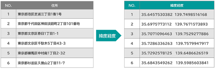 ▲緯度・経度の付与イメージ 保有する住所データに対し、緯度・経度を付与し、正確な位置情報の特定をします。