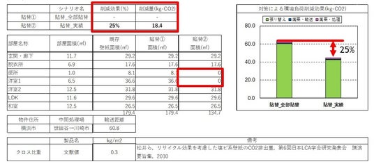 4. 壁紙の張り替えについて、全面張り替え、部分張り替えのシナリオを整理し、壁紙張り替えの環境評価ツール(試作版)により、環境負荷の低減効果を検証