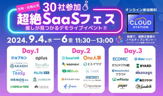 国内にある多種多様なクラウドシステムの中から、自社にあった最適なシステムを選ぶことは簡単なことではありません。そこで、人事労務分野のシステム導入支援を行う株式会社TECO Designは、本イベントを企画しました。本イベントでは、バックオフィス領域でクラウドシステムを提供するベンダーが多数登壇し、3日間で30社のデモ画面を一括比較できるイベントとなっています。