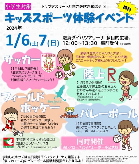 当日は、東レアローズ・立命館大学・平和堂共同企画として「キッズスポーツ体験イベント」を同時開催します。ご参加いただいたお子様と保護者の皆様には、観戦チケットの割引や平和堂全店で使える「お買物券」のプレゼントをご用意しています。これからも平和堂は、東レアローズバレーボール部をはじめ様々なスポーツ支援を通じて、地域が元気で健康になる取り組みを進めてまいります。<平和堂ドリームマッチの概要>