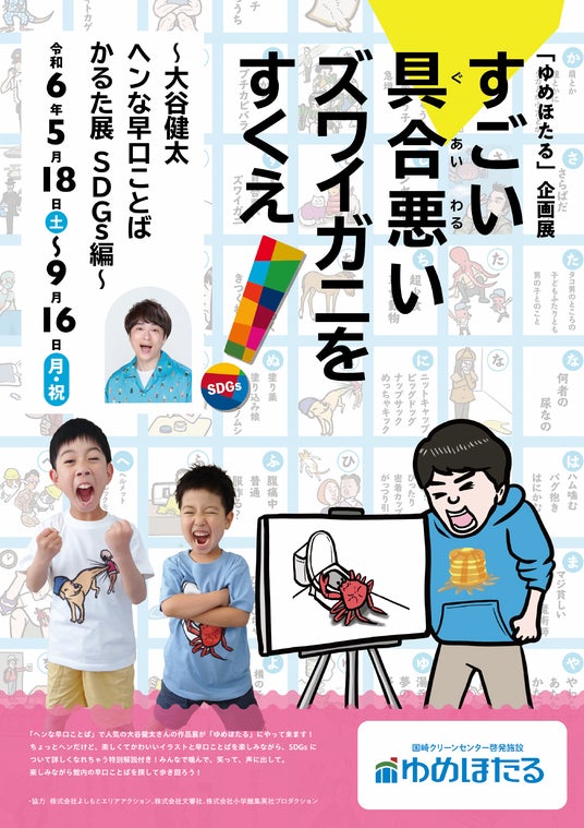 また、市内にある国崎クリーンセンター啓発施設「ゆめほたる」では「ヘンな早口ことば」で人気の芸人、大谷健太さんの作品展を開催。ちょっとヘンだけど、楽しくてかわいいイラストと早口ことばを楽しみながら、ごみ処理や SDGs(持続可能な開発目標)に詳しくなれる特別解説付きの展示となっています。8月4日(日)には大谷さん本人もゆめほたるに来館し、イベント「ネタとトークとSDGs」を入場無料で開催する予定です。