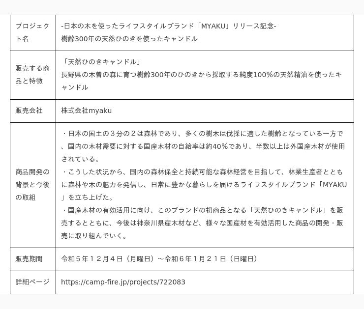 県では、社会課題解決に取り組むベンチャー企業を「かながわ・スタートアップ・アクセラレーション・プログラム(KSAP)」により集中支援するとともに、「かながわベンチャー限定クラウドファンディング『かなエール』を運営し、ベンチャー企業による新たなチャレンジを支援しています。 このたび、同プログラムの令和5年度採択企業である株式会社myakuが、国産木材を有効活用した新商品を開発し、「かなエール」を利用して販売することとなりましたので、お知らせします。