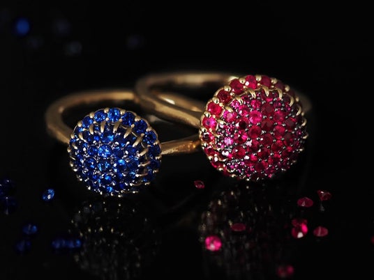 ルビーとブルーサファイアの純粋な発色と輝きを主役にするため、パヴェ部分にはブラックプレーティングを採用しました。極限まで小さく仕立てた爪と地金を「影」として潜ませることで、石と石の境界線が溶けあい、赤と青の色彩がより鮮やかに際立ちます。
