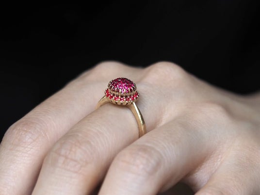 モザンビーク産ルビーの深紅を中心に、大小の石を組み合わせて立体的なモザイクを描いた