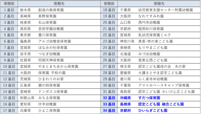 寄贈先は27都道府県34園になります。青字は今回寄贈が決定した園です。
