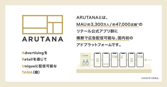 ARUTANAは、リテール企業公式アプリをアドネットワーク化し、横断的に広告配信が可能なリテール公式アプリアドネットワークです。月間アクティブユーザー数(MAU)は約3,300万人*に上ります。