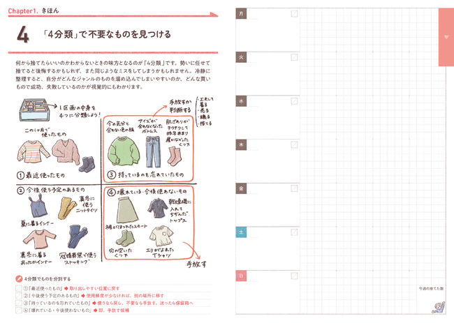 週間ページでは、片付けのコツをイラストつきのコラムで解説しています。