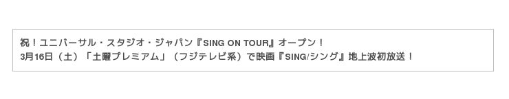 『SING ON TOUR』のオープンにあたり、映画『SING/シング』が地上波で初めて、2019年3月16日の「土曜プレミアム」(フジテレビ系)で放送されます。この番組では、ブタのグンター役の斎藤司さん(トレンディエンジェル)が、オープン直前の『SING ON TOUR』最新情報をテレビで初めてお伝えするコーナーも放送予定です。アトラクション体験前に、映画「SING」の感動を味わおう!