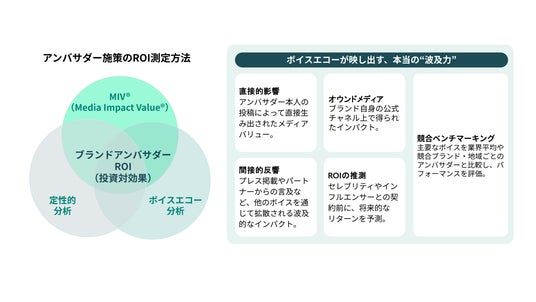 Media Impact Value(R)(MIV(R))は、より高度で総合的なパフォーマンス評価を求めるブランドにとって最適な指標となっています。MIV(R)は、ソーシャルメディア、オンラインカバレッジ、プリント、およびすべての主要なボイス(セレブリティ、インフルエンサー、メディア、オウンドメディア、パートナー)にわたる露出に金銭的価値を割り当て、インパクトを定量化します。さらに、新たな評価フレームワークとして「Voice Echo(ボイスエコー)」を導入。これは、投稿の直接的なパフォーマンスにとどまらず、メディア、インフルエンサー、コミュニティを通じて拡散されるキャンペーンの波及効果を可視化する仕組みであり、どの「ボイス」がブランドの存在感を前進させているのかを把握することができます。