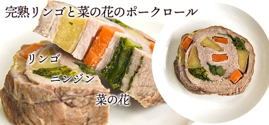 リンゴとニンジン、春を告げる菜の花をくるりと巻いた、彩り豊かなポークロールです。それぞれの素材本来のやさしい甘さが、ポークの旨味とマッチします。季節を感じるご馳走として、特別な日のごはんにもぴったりです。
