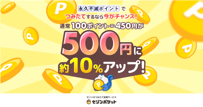 次世代金融インフラの提供を通して組込型金融を実現し、金融がもっと暮らしに寄り添う世の中を創るFinatextグループの株式会社スマートプラス(本社:東京都千代田区、代表取締役:小林 紀子、以下「当社」)が株式会社クレディセゾン(以下「クレディセゾン」)と協業で運営するつみたて投資サービス『セゾンポケット』は、2023年5月つみたて買付分~2023年7月つみたて買付分まで、永久不滅ポイントでお得に資産運用できるポイント買付約10%レートアップキャンペーンを開催いたします。