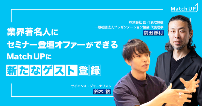 株式会社イノベーション(東証グロース 証券コード3970)のグループ会社である、株式会社Innovation X Solutions(本社:東京都渋谷区、代表取締役社長:遠藤俊一、以下「Innovation X Solutions」)は、業界著名人に企業が主催するセミナー/イベントへの登壇オファーができるマッチングサイト「Match UP」に、サイエンス・ジャーナリストの鈴木祐氏、株式会社 固 代表取締役の前田鎌利氏など、豪華著名人が新たにゲスト登録されたことをお知らせします。