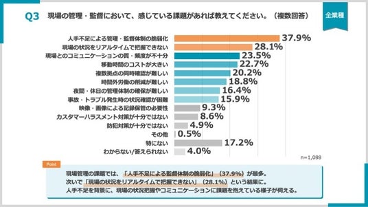 「現場の管理・監督において、感じている課題があれば教えてください。」の問いに対して、「人手不足による監督体制の危弱化」(37.9%)が最も多く、「現場の状況をリアルタイムで把握できない」(28.1%)という結果になっています。人手不足を背景に、現場の状況把握やコミュニケーションに課題を抱えている様子が伺えます。
