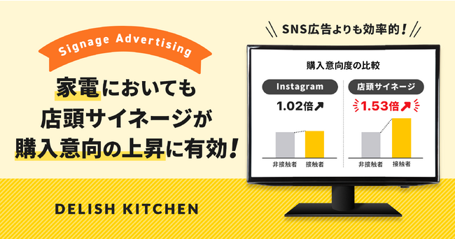 株式会社エブリー(本社:東京都港区、代表取締役:吉田 大成)が運営する『DELISH KITCHEN』は、全国2,300店舗以上のスーパーマーケットの店頭サイネージで、レシピ動画を活用した広告配信プラットフォーム「ストアビジョン」を運営しています。このたび、パナソニック株式会社の冷蔵庫のプロモーションにおいて、広告接触者の購入意向度が、非接触者に対して1.5倍以上上昇したことが分かりました。また、Cost Per BrandLift(=1人あたりの態度変容単価、以下 CPB)は、Instagram広告の3分の1となり、非食品分野でも「ストアビジョン」の優位性が実証されました。