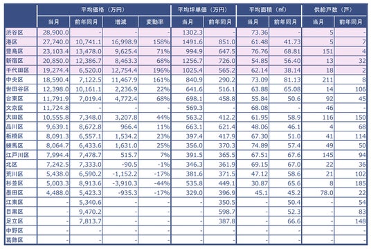 東京23区の各行政区毎に、平均価格、平均坪単価、平均面積、供給戸数をまとめました。当月の平均価格が大きい順に表示しています。